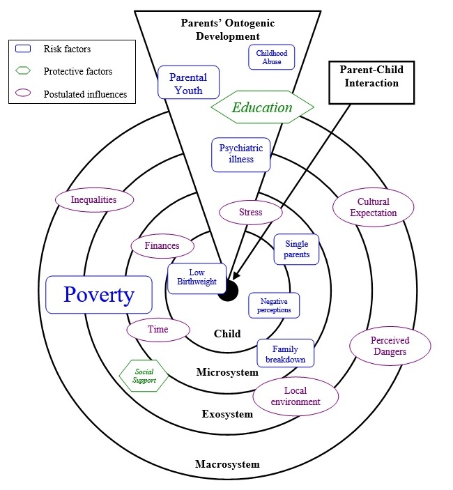 Even at this very early stage of the research, it was clear that complex relationships exist between parental background factors and other levels of the ecological model, particularly socio-economic factors.  Whilst psychodynamic theories are important, they are not, in themselves, adequate models to explain child maltreatment.  The concept that abusing parents are somehow different or abnormal is not supported.  My findings suggest that strategies to prevent teenage pregnancies and to work with and support young parents could be effective in reducing child maltreatment and should be evaluated with this outcome in mind.  They also support strategies to encourage and facilitate full secondary education for all, including measures to ensure that teenage parents are not denied opportunities for education.  I would emphasize however that this knowledge should be used not to label young parents as “potential abusers,” but to support such parents in the very difficult task of bringing up their children.